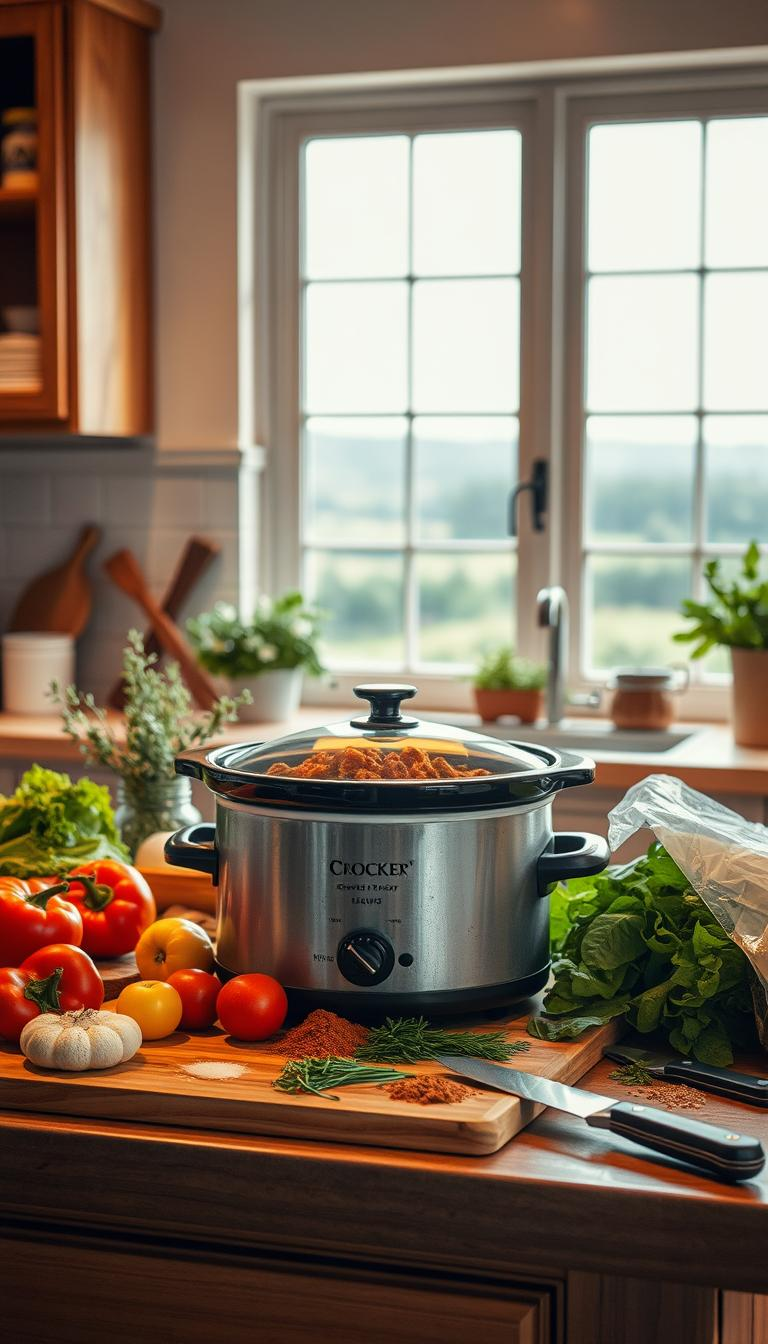 A cozy kitchen counter with a modern slow cooker in the foreground, surrounded by fresh ingredients like chicken, vegetables, and spices. Warm, natural lighting filters through the window, casting a soft glow over the scene. In the middle ground, a selection of simple, hearty crockpot recipes are displayed on a tablet or cookbook, showcasing their ease and deliciousness. The background features a clean, minimalist interior with wooden accents, hinting at the comforting, homemade nature of the dishes. The overall atmosphere is one of simplicity, convenience, and the inviting aroma of a slow-cooked meal.